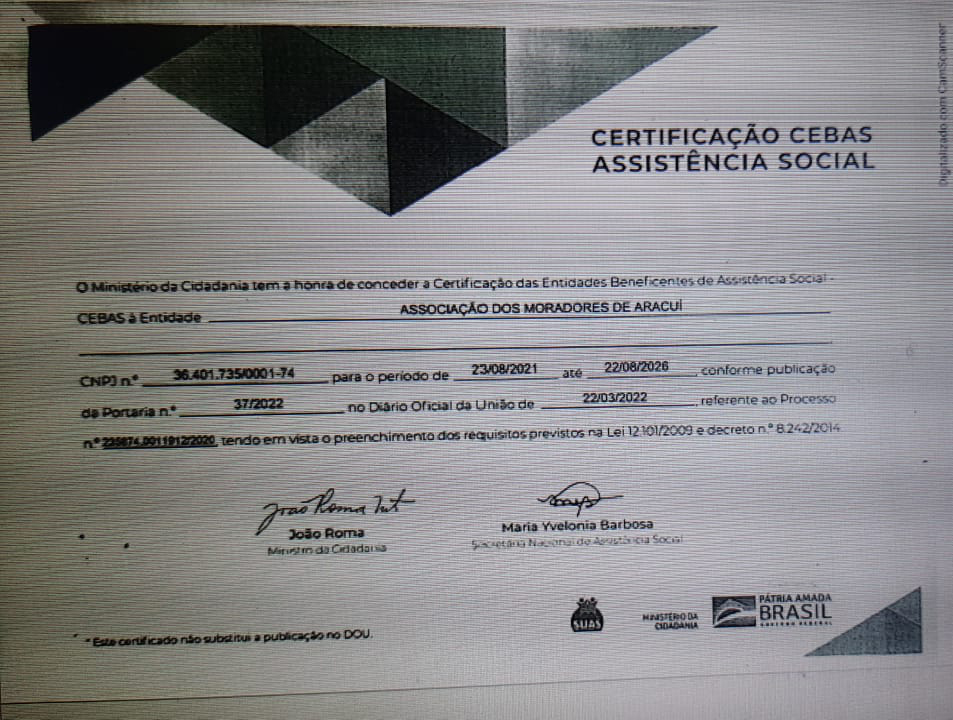 Fundada em 30 de junho de 1991, a Associação de Moradores de Aracuí (AMA) nasceu da iniciativa de um grupo de moradores preocupados com o bem-estar da comunidade. Desde então, a AMA se consolidou como uma entidade filantrópica, voltada para o fortalecimento da organização comunitária e o desenvolvimento social do Distrito de Aracuí.